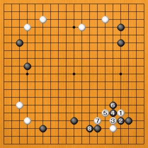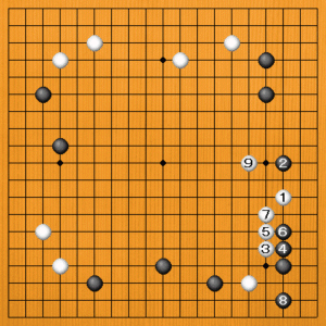 白1に黒2とツメてくれば、それから白3とカケるのがぴったりです。黒4、6とハッて8まで治まるくらいですから、黒を隅にへこませたことで白は満足できます。次に白9のボウシがいいところになります。黒石の多いところで、これだけ頑張れば十分です。