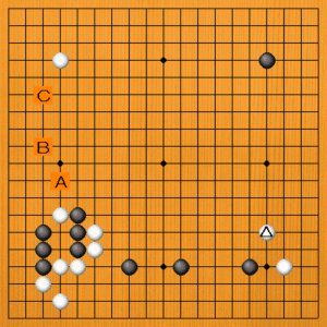 白が△と受けたところです。次の一手を、A~Cの選択肢の中から示してください。