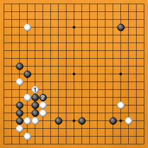 白1とハネれば逃げることはできますが、黒2と出る手が白を分断して好形です。左辺の白が治まるまでは大変ですし、白がモガけばモガくほど、黒がよくなっていくでしょう。