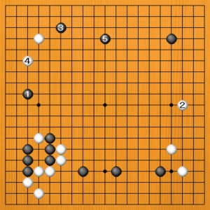 黒1に白2と大場に向かえば、次いで黒3の方からカカるのが正しい方向です。白4の受けに黒5とヒラいて、上辺を黒の勢力圏にします。黒は左辺と上辺の両方を打って、思い通りの展開です。