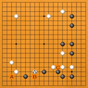 白△に臨んだところです。次の一手を、A~Cの選択肢の中から示してください。