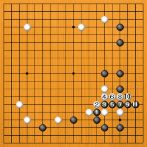 黒1から3とこっちを切るのも有力です。白4のアテから6と出て行くくらいですが、黒11まで応じて、右下の黒地が大きくなります。これも黒成功です。