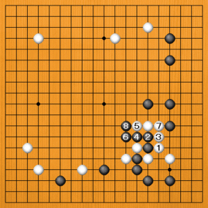 白1の方からアテて、隅の白を助けるのは、黒2の出から8のマゲまで、下辺で得をしながら、攻めを続けます。白は苦しい姿です。