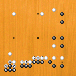 黒1(B)の下ツケも失敗です。白2のノビから4と止めて、6のブツカリから10のツギまで、白が厚くなります。