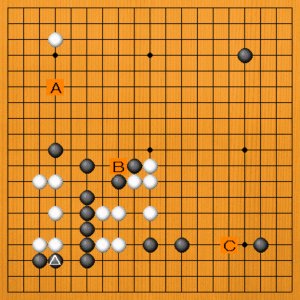黒△にワタったところです。次の一手を、A~Cの選択肢の中から示してください。