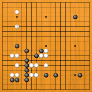 白1(A)のシマリは大きな手ですが、この場面では最善ではありません。左下から中に出ている黒は、すでに根拠がありますから、白1の手が黒に対してあまり響かないのです。