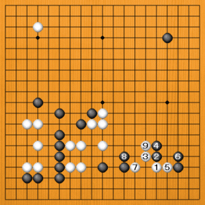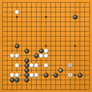 白1に黒2とコスんで出ようとしても、白3とトベば、下辺の黒と右下の黒を両方きれいにシノぐのは難しいでしょう。カラミ攻めになっていて、白が大いに有望です。