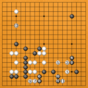 白1には、黒2と受けるくらいかもしれません。それなら、白3のツケから5と封鎖して、黒を小さく生かします。黒6から10とコスんで、頭を下げていれば生きることはできるでしょう。しかし、小さく生かせば、白は十分です。白9に石が来て、左下の黒の眼が薄くしていますから、白は攻めの効果を上げました。悠々白13とシマっていい流れです。