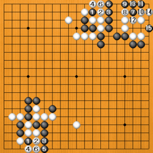 この場合は黒1のキリからいくと、黒のダメがつまってしまい失敗でした。