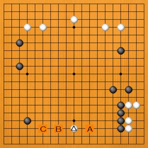 白が△とワリ打ちしたところです。次の一手を、A~Cの選択肢の中から示してください。