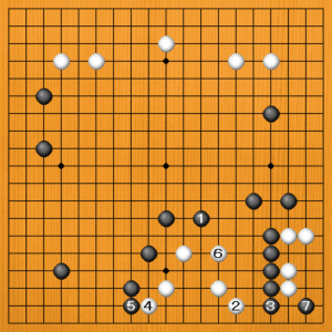 黒1と止めて、白の形が窮屈です。下で生きるしかありませんが、白2、4と二つコスんで6と小さく眼を確保している間に、周囲の黒がどんどん強くなります。黒7とトビ込めば、右下の白は生きるかどうかも分からないくらいです。
