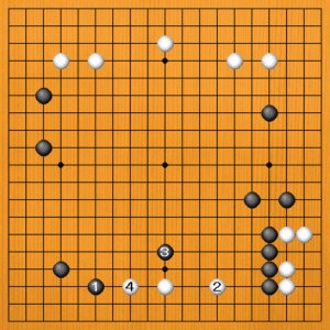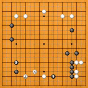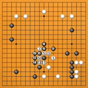 白1と中に出てくるでしょうが、黒2のボウシから気持ちよく攻めて、黒が好調です。白3のコスミには黒4のケイマがいい感じです。白5の押しから11のカカエまでが予想されますが、黒12、14と止めて、外側がぴったり止まります。右下の黒の厚みを攻めに活用した、理想的な展開です。
