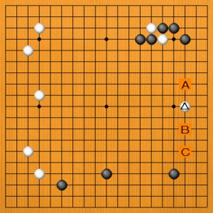 白が△とワリウチしたところです。次の一手を、A~Cの選択肢の中から示してください。
