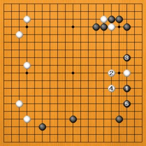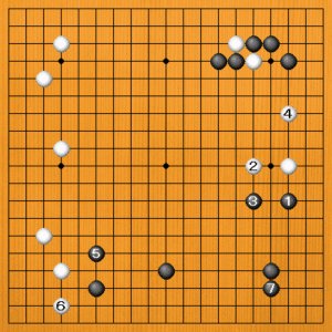 黒1には白2とトンでくるかもしれません。黒3のトビを待って白4とヒラけば、白の形に余裕ができます。それでも、黒5のトビから7とシマる構想で十分です。黒模様のスケールは前図にかないませんが、これでも黒が満足でしょう。