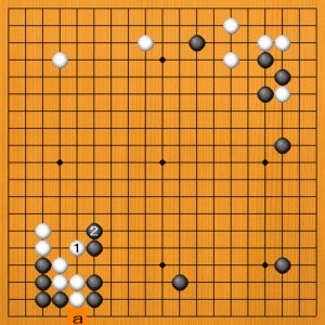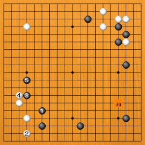 黒1(A)のトビは模様を広げる手です。白2と隅を守れば、黒3の肩ツキから広げてスケールが大きくなります。黒3ではaと右下に芯を入れるのも有力です。
