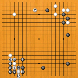 黒1に対して、白2など他を打てば、黒3の三々が厳しい手になります。白4に黒5とハウのが肝心で、白10のツギに黒11とオサえます。白12とさえぎるのは無理で、黒13の切りで白が困っています。