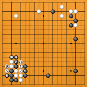 続いて、白1から出て行くしかありませんが、黒4とノビて白は両方サバく形がありません。白5とハネても、黒6のノゾキを決めて8とオサえます。黒10とマゲて、白は収拾がつきません。