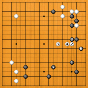 黒1(A)がいい構えで、百点満点の手です。白2の肩ツキから消してくれば、黒3と押して5とスベっておきます。もう一手白6とトベば穏やかですが、黒7と下辺を地にすれば黒十分でしょう。