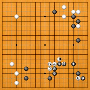 黒1に白2のボウシから消してくれば、黒3、5とツケ引いて、右下を大きな地にします。白8のツケには黒9とハネて全部取ってしまいましょう。