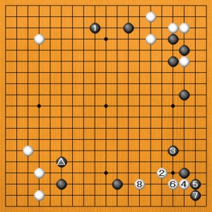 黒1(B)と上辺を守るのは、今回は80点くらいに減点です。すでに黒△のトビを打っていて、下辺から右下に掛けて大模様を張っていますから、それを放っておいて他に打つのは一貫性に欠けています。碁は前に打った手に責任を持って構想を立てなければなりません。白2に入って来られると、黒3と受けてから白8まで、白が治まるのは簡単です。こうなってみると、黒△の一手がなんのために打ったのか分からなくなります。