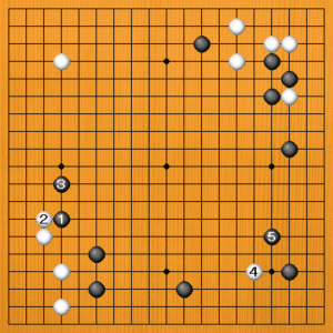 黒1(C)の肩ツキも文句なしの百点です。白2のハイに黒3とトンで、スケールの大きな黒模様を作ります。白4と入ってくれば、黒5のケイマでふつうに応じれば十分です。