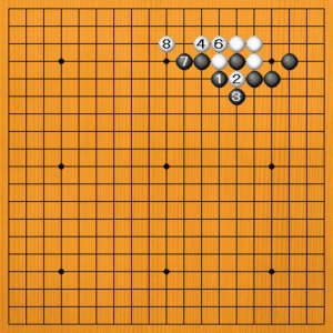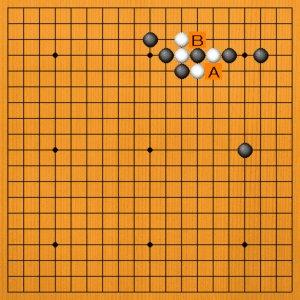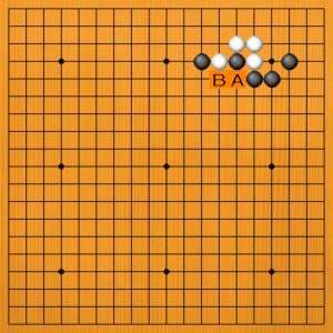 黒1(B)が正解です。白2と取られますが、黒3とオサえてコウの形です。これで白の出口を止めることができました。白4のハネに黒5とコウを取ります。黒7とノビて白8のトビまでで一段落です。