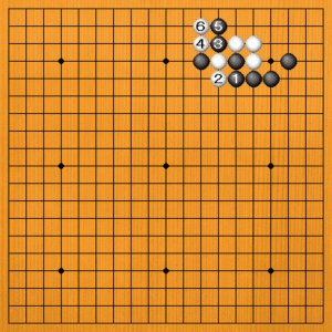 黒1(B)と逃げるのは失敗です。白2のアテから4とツガれて、黒が割かれ形になっています。