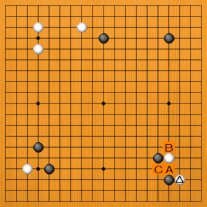 白が△にツケ返したところです。次の一手を、A~Cの選択肢の中から示してください。