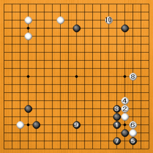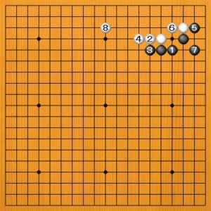 黒1とヒクのもあります。白2のノビに黒3と押してから、黒5のハネを利かします。黒7とカケツいで右辺は手厚い構えになりました。白8とヒラいて、白は上辺を取ります。