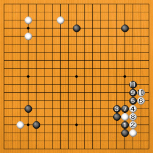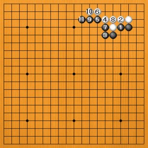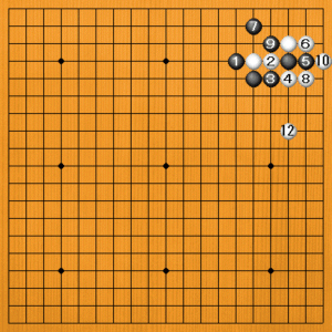 黒1とハネる型もあります。白2のブツカリから4と切ってきますが、黒5と二子にして捨てます。黒7のケイマが形で、黒11のホウリコミに白12とヒラいて一段落です。黒は中央から上辺に厚い形です。白は右辺に変化しました。