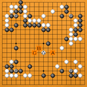 4子局です。黒模様に白が△と消しに来たところです。次の一手を、A~Cの選択肢の中から示してください。