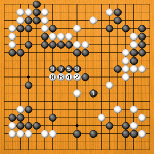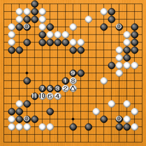 黒1(B)のケイマから、厚みを囲うのが正解です。白2の押しには黒3とハネます。白4のハネには黒5と引いて受けます。白8のマゲに黒9とオサえて止まっています。黒11まで、黒の厚みが大きな地になっています。