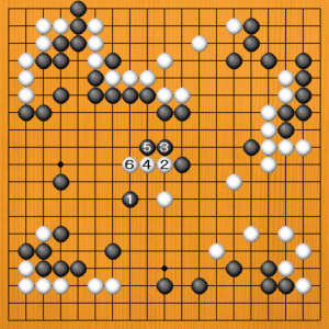 黒1の後、白2のツケに黒3とトベば、左辺の黒の厚みは囲うことができます。しかし、白4から6とこっちを打たれると、黒△の石が飲み込まれて、白地も大きく増えてしまいます。正解図は、黒が一方的に厚みを地にしていますから、だいぶ違っています。