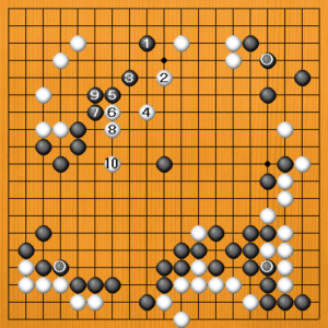 黒1で上辺に圧力を掛ければ、白はこれ以上荒らされないように、白2と受けて地を確保したくなります。それなら、黒3の押しから9までビシビシ決めるのが有力です。スケールの大きな地模様ができました。白地も制限していますから、黒の理想的な展開です。白10と消してきても、黒11と受けていて十分です。