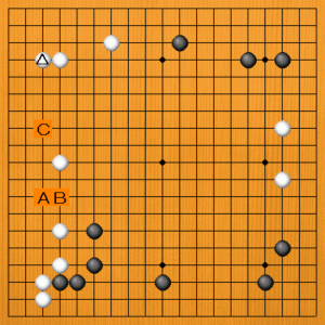 白△とシマったところです。次の一手を、A~Cの選択肢の中から示してください。