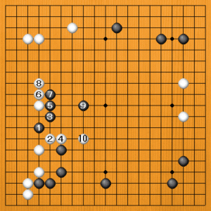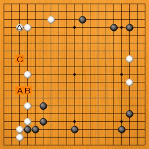 黒1(C)の打ち込みも、後がうまくいきません。白2のブラサガリが左辺の守りになっています。黒3とトンで中に出ることは出来ますが、白4のノゾキから6、8とトンで追い掛けられると、黒9まで逃げるしかありません。白8まで中央に顔を出してから、白10の肩ツキがぴったりになります。下辺の黒模様が消されて、黒の不本意な展開です。