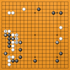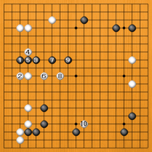 白1とサガって、黒の眼形を脅かしてきても、怖がることはありません。黒2のケイマを利かしてから、黒4と一本出て白の断点を強調するのがいい手順です。それから黒6とオサえれば生きています。白7とツイで断点を守るくらいですから、黒8のノゾキを決めて、黒10と右辺の白に肩ツキするのがいいところになります。下辺の黒模様を広げて、スケールの大きな碁になりました。