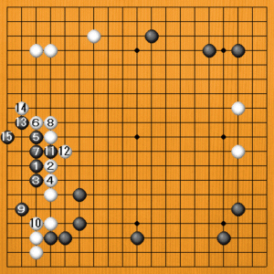 黒1(A)と三線に打ち込むのが正解です。白2とツケられて、中央には出られなくなりますが、黒3のノビから5とツケて、辺で生きるスペースは十分あります。黒9のケイマが白の弱点を突いた急所で、黒13、15とハネカケツいで大きく生きることが出来ました。黒の生き方も立派ですし、下辺の黒模様が傷んでいないのもプラス材料です。