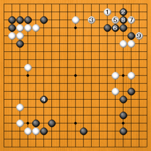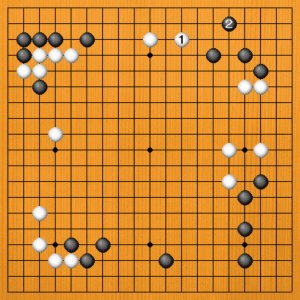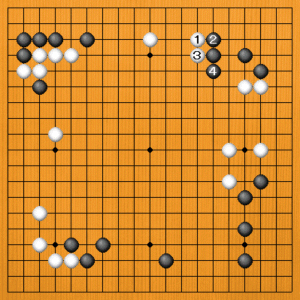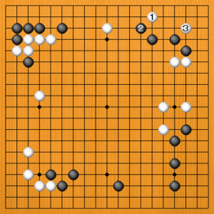 白1に黒2の方から動いてくるなら、白3と三々に入ります。隅を荒らせば、白が満足です。