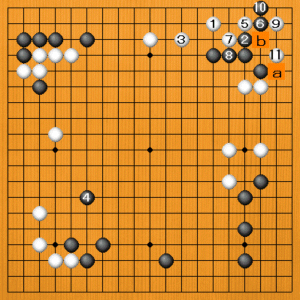白1に黒2とサガってきたときも、いったん白3と守っておきます。黒が手を抜けば、白5のツケが狙いのある手です。黒6のオサエに、白7のフクラミから9とツケるのが手筋です。黒10とサガれば、白11のトビで、aのワタリとbの切りが見合いです。
