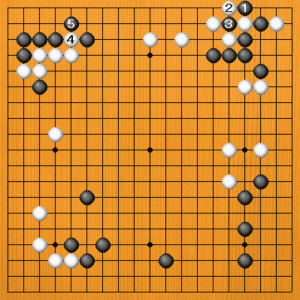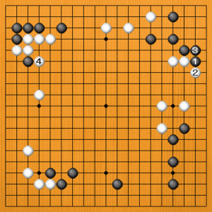 黒1、3とハネツいでおくところでしょう。これで隅が立派な地になります。ただ、白としては上辺の石を先手で安定させましたし、白4のハネに回れば十分満足できる展開です。