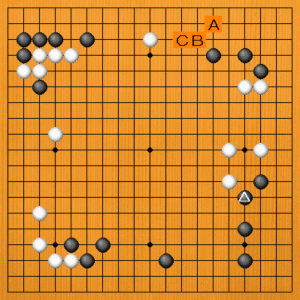 黒△とコスんだところです。次の一手を、A~Cの選択肢の中から示してください。