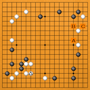 白△とナラんだところです。次の一手を、A~Cの選択肢の中から示してください。