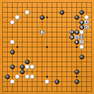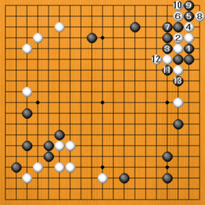 黒1に白2の方をツゲば、ここで黒3と切ります。白4のマゲには、黒5と二段にハネるのが手筋です。黒9とノビて二子にして捨ててから、黒11とアテて13とカカえます。隅は譲っても、外側の白がボロボロになりますから、黒の方が大いに優勢です。隅の白はもう一手入れれば生きますが、たいした問題ではなくなっています。
