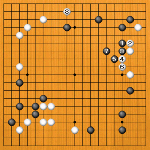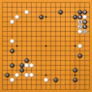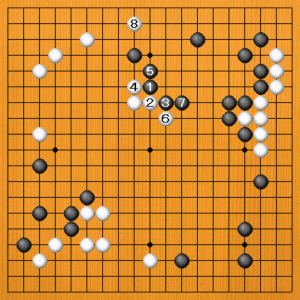 黒1に白2とコスむのは、白△を助けて、黒1の石を取ってしまおうというものです。黒3の出に、白4とオサえます。ここで、黒5と切るのはハマリで、白6と急所にオサエ込まれて、黒二子が助かりません。黒7とマゲても、攻め合いは白が勝っています。これは、黒5の切りが早すぎたのです。