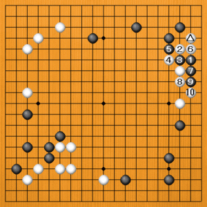 黒1(A)の肩ツキは、厚みを作る作戦です。白2の受けに、黒3のコスミから5、7と外側を固めます。黒11のツギまで、白の出口を止めて上辺の模様を広げます。確かに厚みは出来ましたが、白は右辺を固めてもらって、不満はありません。