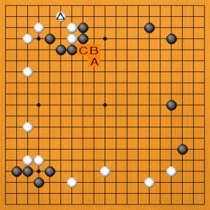 白△とコスんだところです。次の一手を、A~Cの選択肢の中から示してください。
