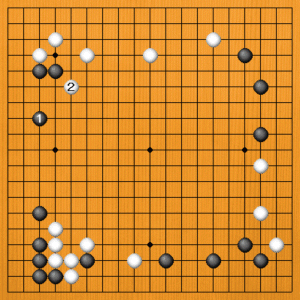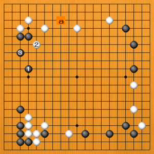 黒1(A)の三間ビラキは常識的な手ですが、この場合は失敗です。白2のカケが利きますから、上辺の白模様が広がります。黒としてはaなどの打ち込みを狙いたいところですから、白2を利かされるのは不都合なのです。