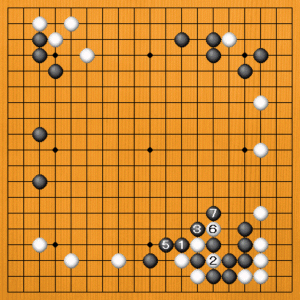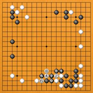 黒1には、白2とツグくらいですが、ここで黒3とオサえるのが、白のダメを詰めるいい手です。白4のツケには、黒5とハネます。白6の切りなら、黒7、9とアテツいで、白石を飲み込みます。