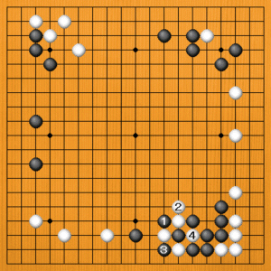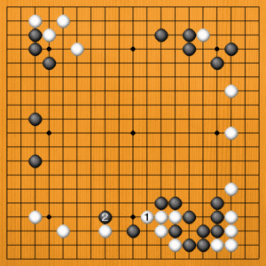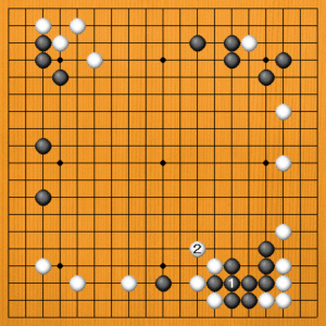 白1のグズミなら、白を愚形にして黒は満足です。右下の黒はしっかりしていますし、黒2のツケから仕掛けて、白への攻めを狙います。